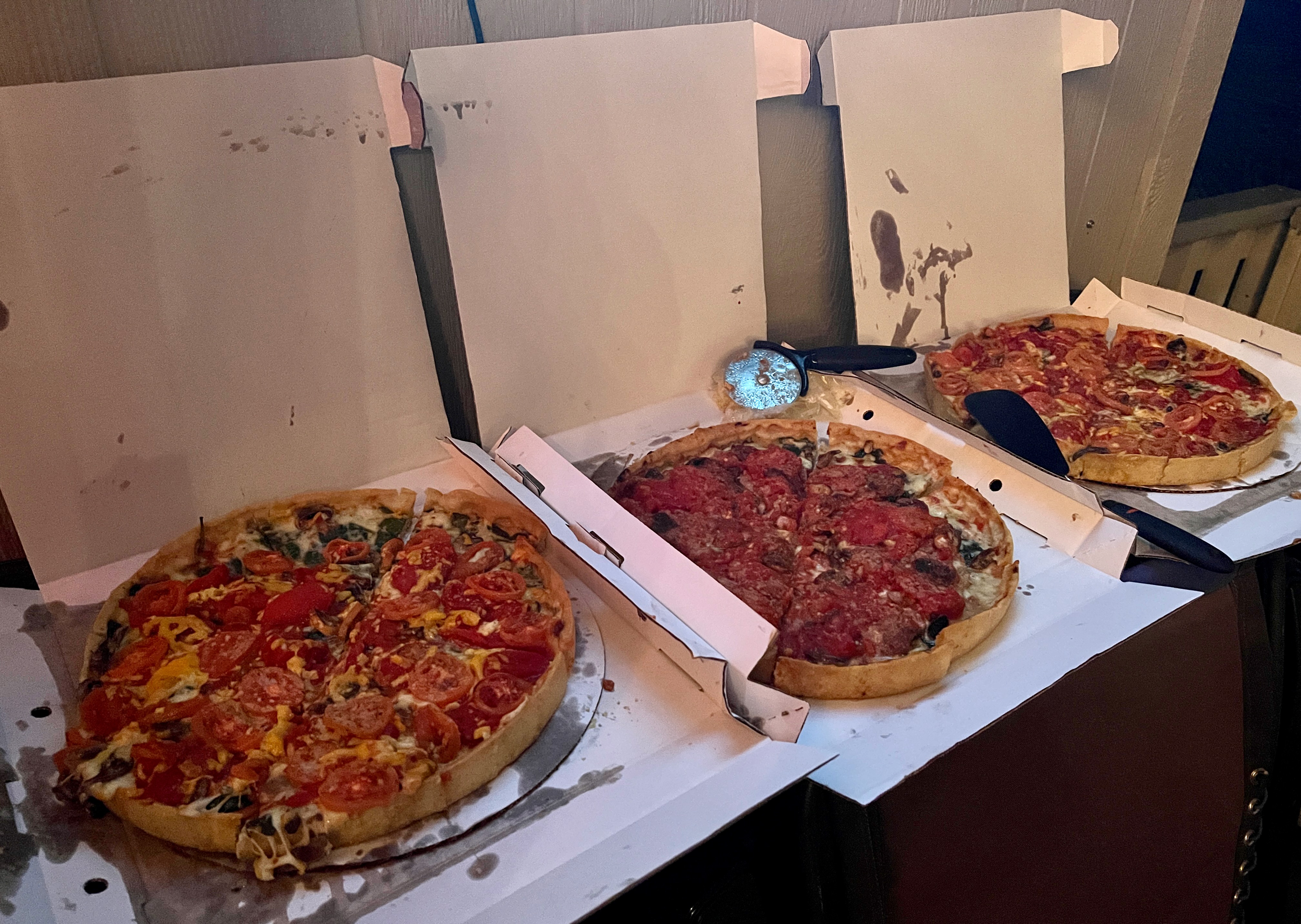 Kari thought we needed 3 large deep dish pizzas for 6 people, lol (full size)